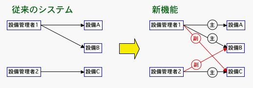 1台の設備を複数の設備管理者アカウントで管理出来る機能を実装しました。 1台の設備に1名の主設備管理者と複数の副設備管理者を登録できます。