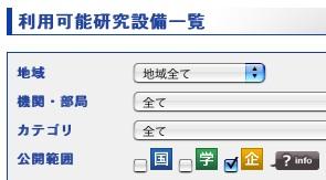 に各設備の公開範囲を表示するようにしました。 企業に解放されている装置だけを絞り込んで表示させる事も出来ます。